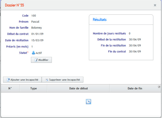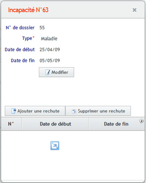 Les informations à sélectionner sont le type d’incapacité (ou protection) et les dates de début et de fin. En cas d’incapacité maladie ou accident, des périodes de rechute peuvent également être saisies.