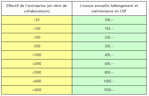 Les prix (HT) comprennent la licence la maintenance et l’hébergement des données. Les prix sont déterminés en fonction de la taille de l’entreprise en nombre de collaborateurs (effectifs). Des solutions en hébergement local peuvent être proposées sur demande.